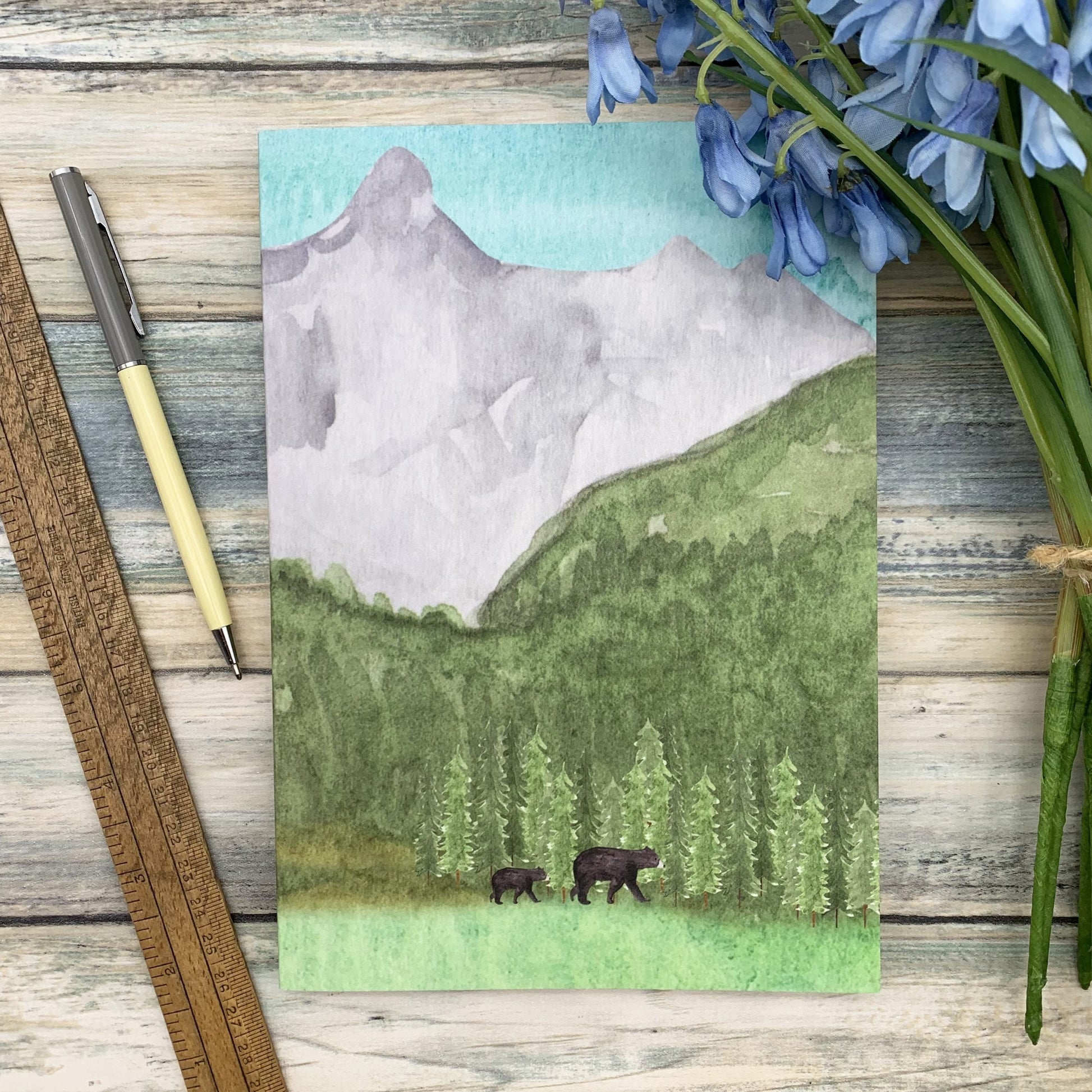Introducing this gorgeous Bear notebook. Featuring a hand painted British Columbia Mountain scene featuring black bears amongst mountains and forests. Great for someone who loves adventure and the Pacific Northwest.
