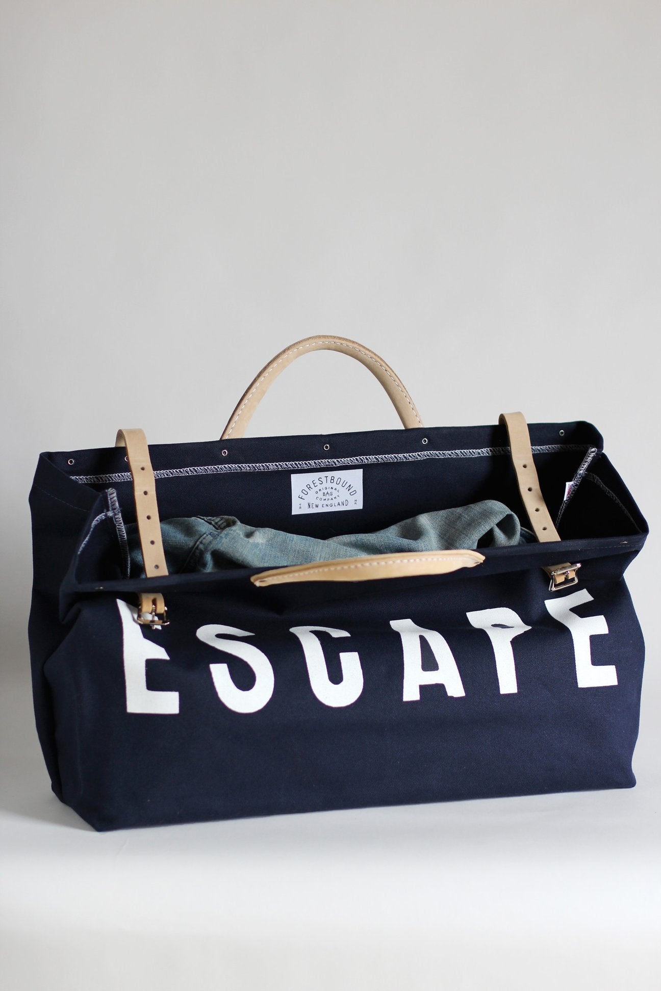 The Forestbound ESCAPE Canvas Utility Bag is made from sturdy 18oz beige canvas. Features split leather handles and buckle straps with metal hardware. Also features metal feet on the base of the bag, a water resistant fiberboard interior bottom panel, and 12 gauge rivet secured steel dowels at the top opening of the bag to provide a wide opening as well as a secure closure.